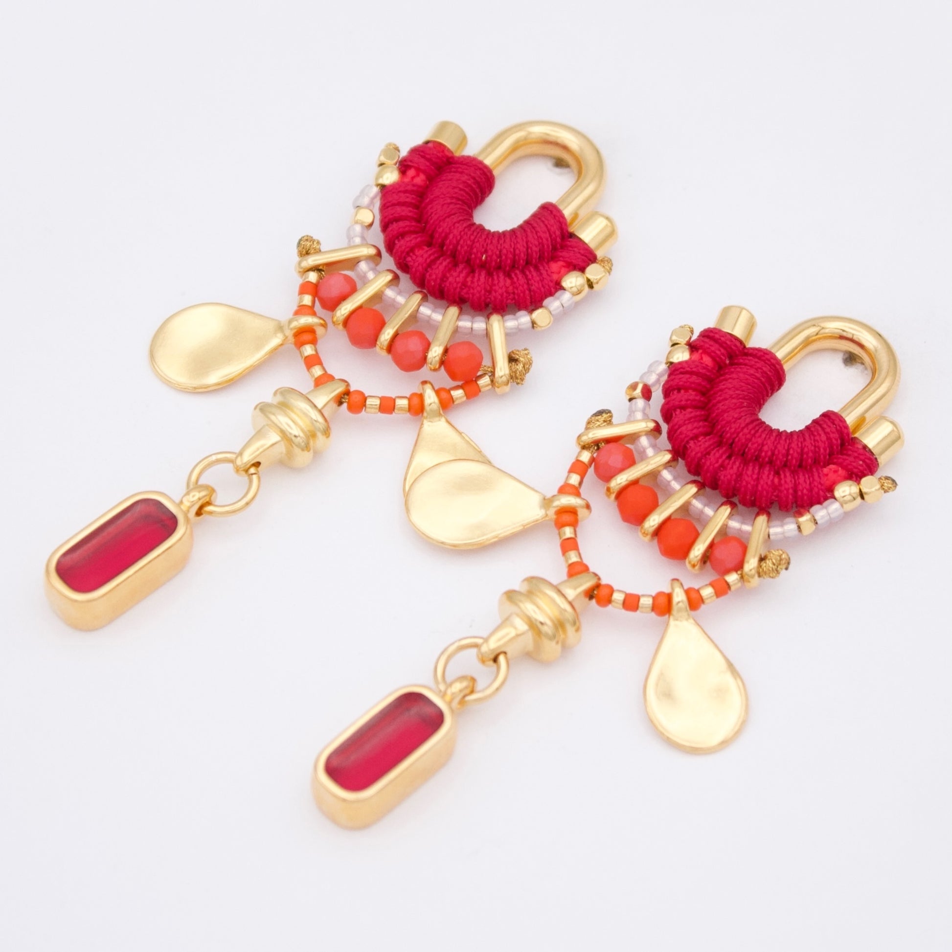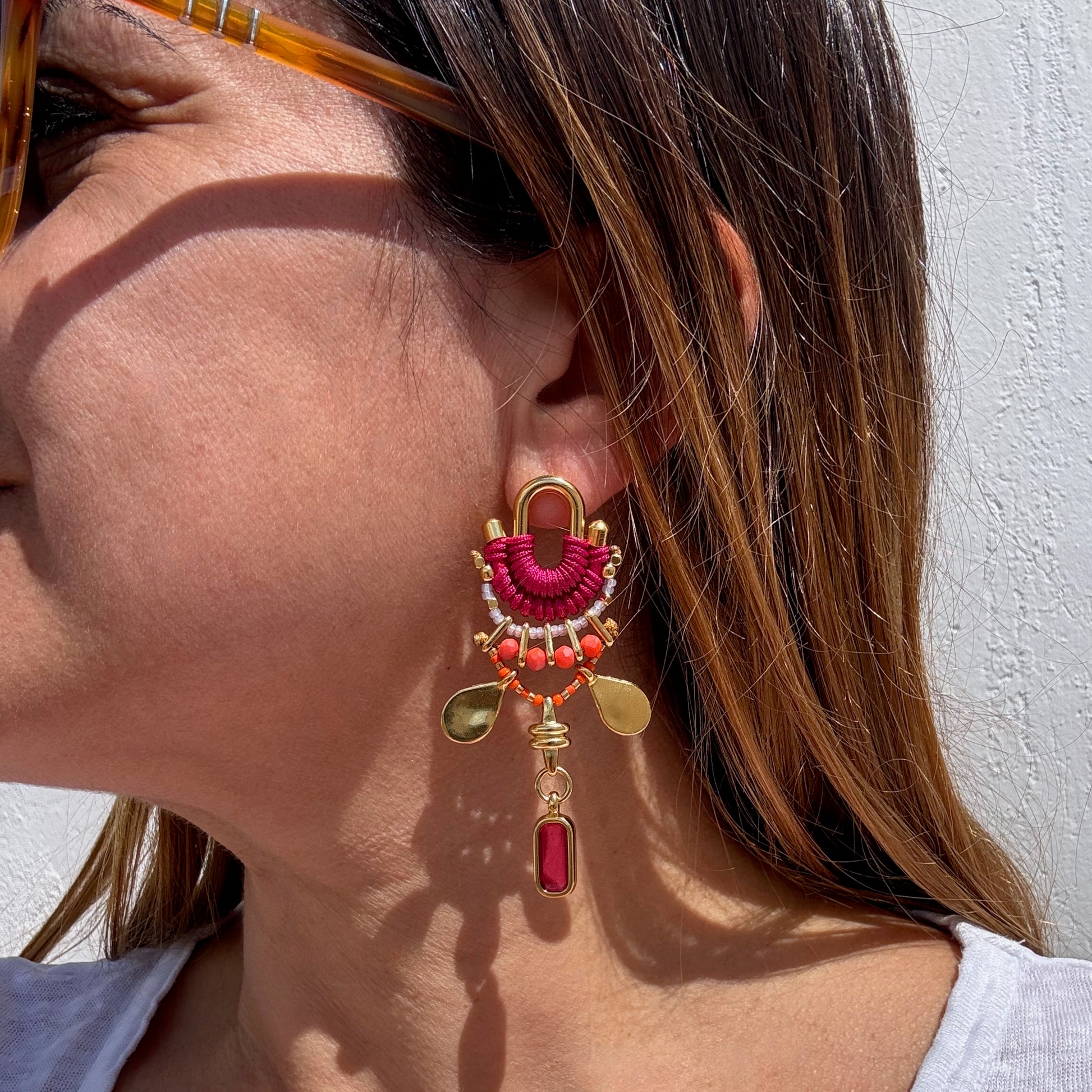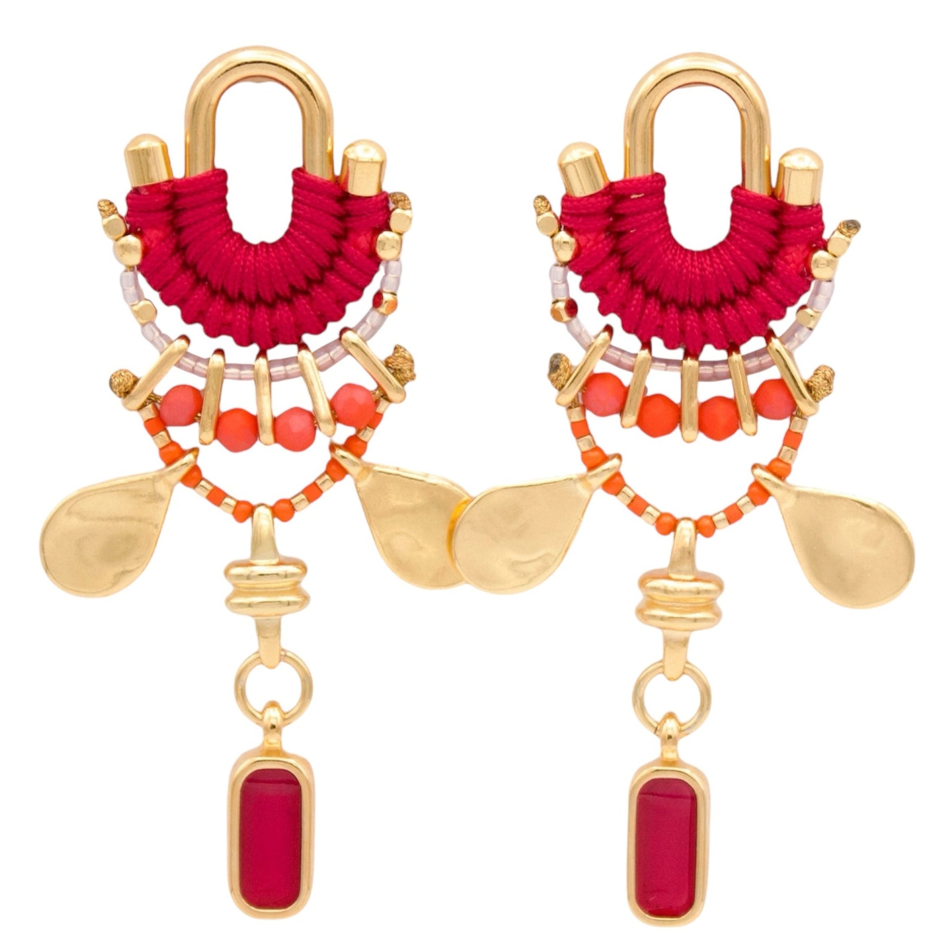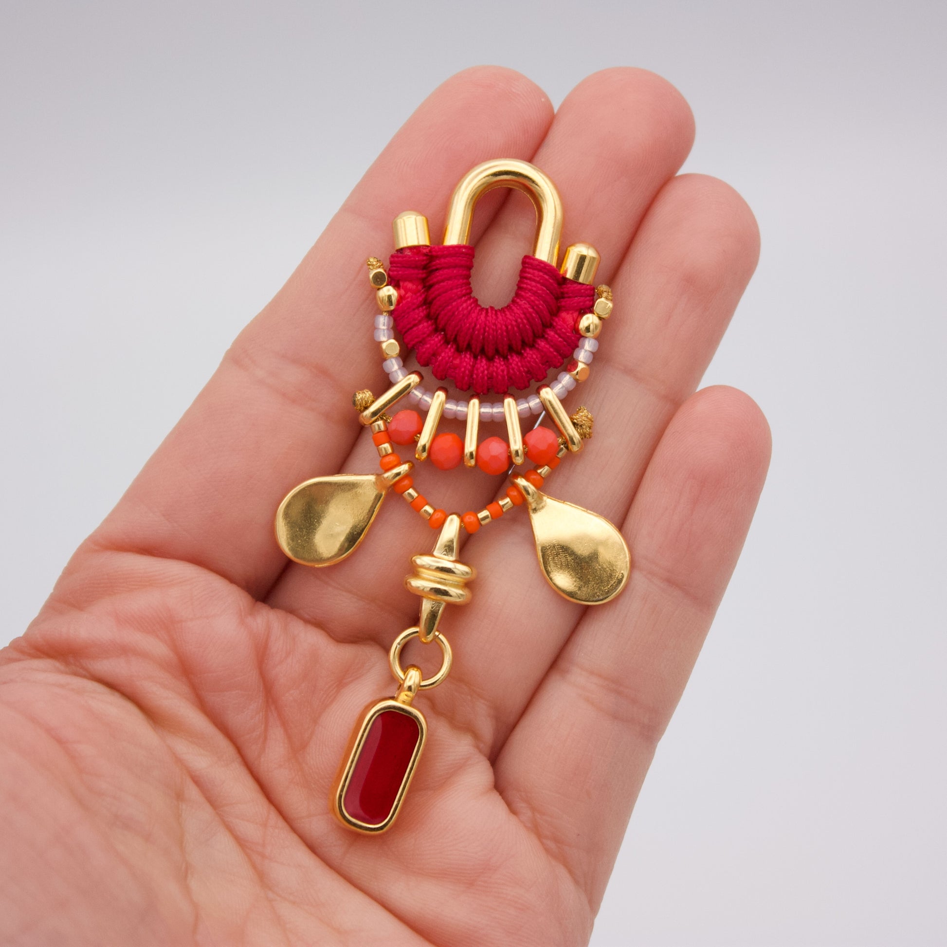 If you want to enhance your look with special accessories, these Calima earrings are a great option. Woven with thread in cherry red tone, adorned with beads in orange hues and golden pieces, they will make you the center of attention. You can wear them during the day or at night because they go well with any outfit. If you want to feel unique and beautiful, these earrings are your best ally. Don't miss out on them!