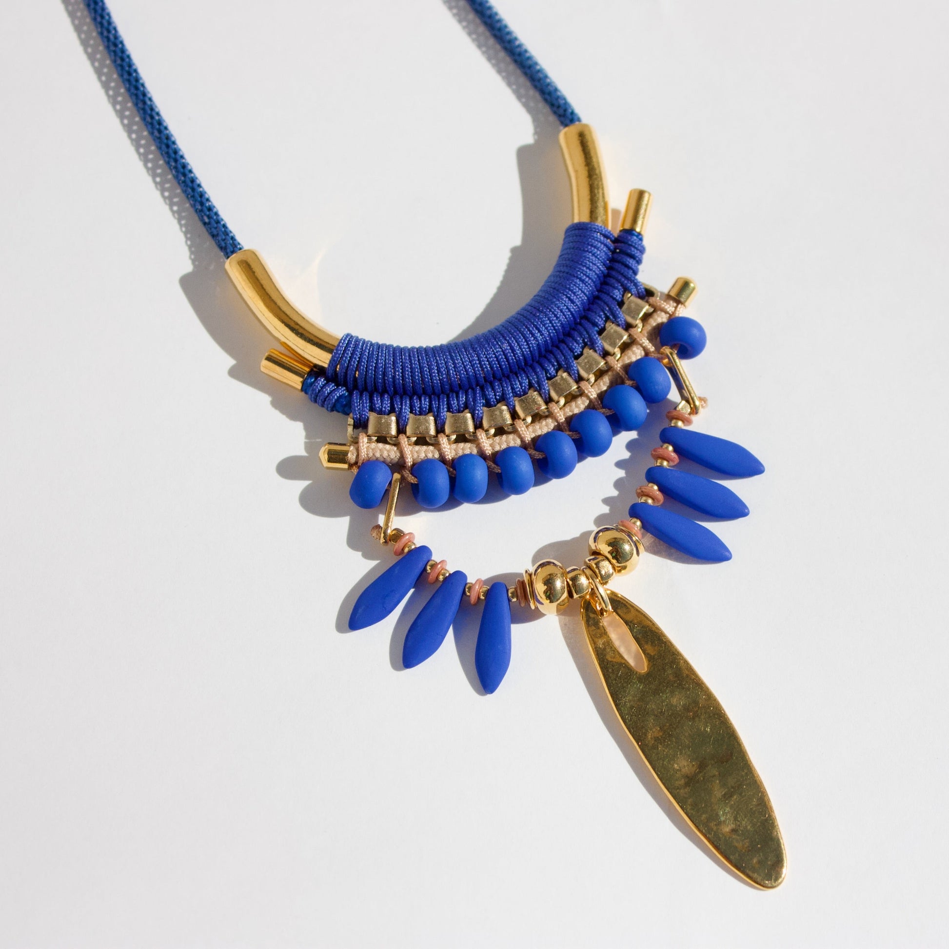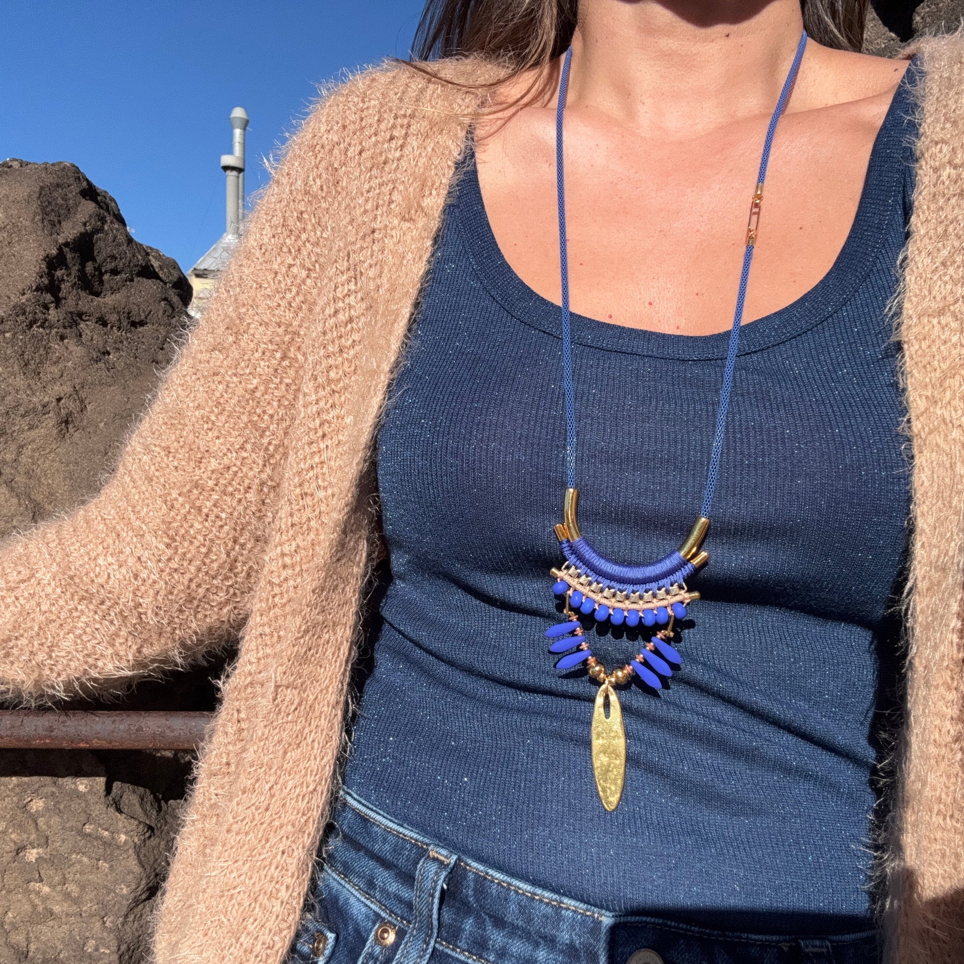 A celebration of color and artistry, this Frida-inspired necklace brings light and soul to any look. Its elegant royal blue chain —long enough to fall gracefully below the chest— adds movement, charm, and a whisper of freedom to your style.